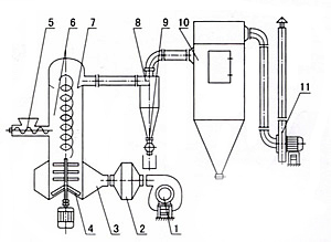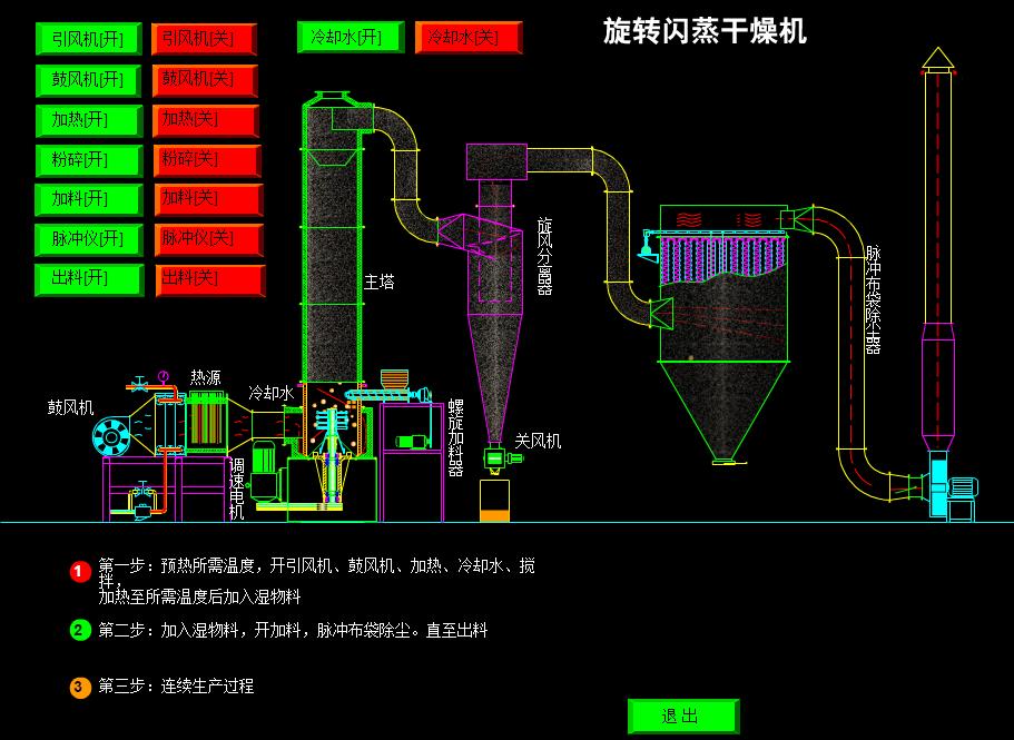 工作原理: 熱空氣由入口管以適宜噴動速度從干燥機底部進入攪拌粉碎干燥室,對物料產(chǎn)生強烈的剪切、吹浮、旋轉(zhuǎn)作用,于是物料受到離心、剪切、碰撞、磨擦而被微?;瑥娀藗髻|(zhì)傳熱。在干燥機底部,較大較濕的顆粒團在攪拌器作用下被機械破碎,濕含量較低、顆粒度較小的顆粒被旋轉(zhuǎn)氣流夾帶上升,在上升過程中進一步干燥,由于氣固兩相作旋轉(zhuǎn)流動,固相慣性大于氣相,固氣兩相間的相對速度較大,強化兩相間的傳質(zhì)傳熱,所以該機生產(chǎn)強度高。 閃蒸干燥機的工作原理較容易理解。我們可以將整個干燥過程分為4個階段—破碎階段、氣固混合階段、干燥階段以及粒度分級階段。破碎階段:破碎是整個閃蒸干燥過程的第一步也是較重要的一步。被干燥的物料狀態(tài)主要是膏狀、濾餅狀。如沒有破碎就不能進行閃蒸干燥,由此我們可以得到一個結(jié)論:黏性強的物料如直接使用閃蒸干燥機其干燥效果較差,需要適當(dāng)加入添加劑避免物料結(jié)塊。該過程中主要是攪拌片與高速旋轉(zhuǎn)的氣體配合完成粉碎。氣固混合階段:經(jīng)過粉碎后,物料在閃蒸干燥主塔內(nèi)與加熱介質(zhì)充分的接觸。其中,氣固混合的好壞決定整個干燥速率的大小。為了提高氣流速度,在閃蒸干燥機的底部設(shè)置倒錐結(jié)構(gòu)裝置。干燥階段:該過程是熱空氣蒸發(fā)物料水分的過程。未完成干燥的物料受到重力的作用下落,繼續(xù)破碎與干燥;完成干燥的物料會向上運動,進行下一階段。粒度分級:在干燥主機的上部設(shè)置環(huán)形擋板,此被稱為閃蒸干燥機分級器。當(dāng)物料運動經(jīng)過該分級器時變會受到離心力的作用,呈現(xiàn)不同旋轉(zhuǎn)半徑螺旋上升的趨勢。粒徑較小的物料從分級器的內(nèi)孔排出;顆粒較大的物料被留在干燥室內(nèi)繼續(xù)粉碎,待達(dá)到標(biāo)準(zhǔn)粒度從內(nèi)孔排出。